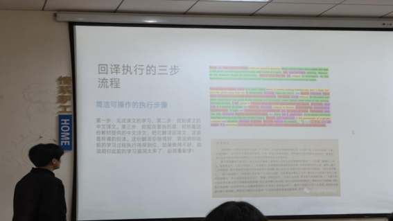 随后,杨润聚焦写作与翻译模块,详解“回译法”应用技巧,拆解练习步骤,助力同学们提升语言表达的精准度与地道性。