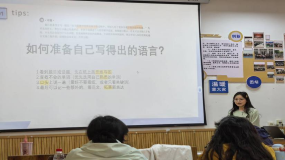 紧接着,王璇结合自身高分通关经历,分享写作思维导图构思、翻译难词处理与句式优化技巧,建议在语境中积累词汇提升运用能力。